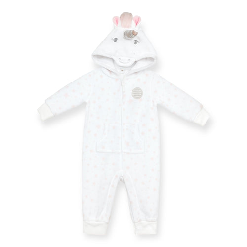 Body enterizo polar blanco con capucha de unicornio y estampas de estrellas