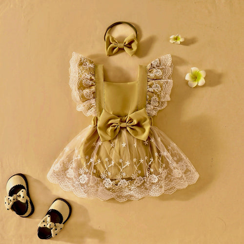 Body vestido beige con volados de encajes y vincha