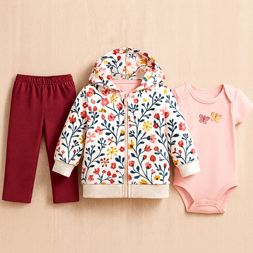 Body rosa, pantalón bordo y abrigo floreado con capucha