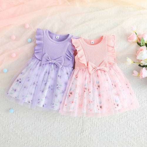 Vestido azul de un solo hombro estampado con tul rosa y moño