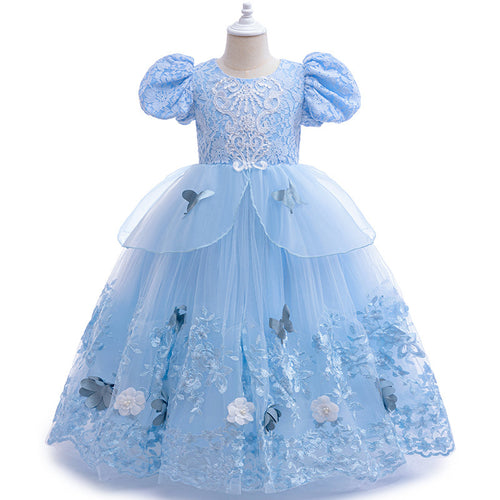 Vestido largo celeste bordados de flores y mariposas con mangas abullonadas