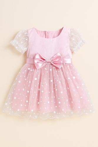 Vestido rosa con mangas abullonadas y falda de tul con motas blancas
