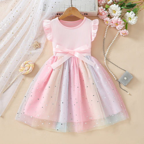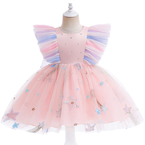Vestido rosa con lentejuelas, flor 3D, tutu irregular