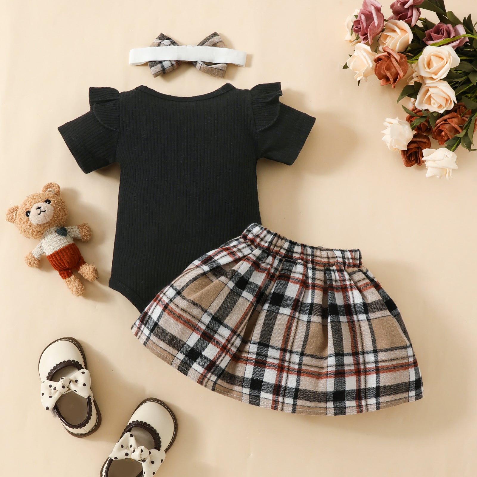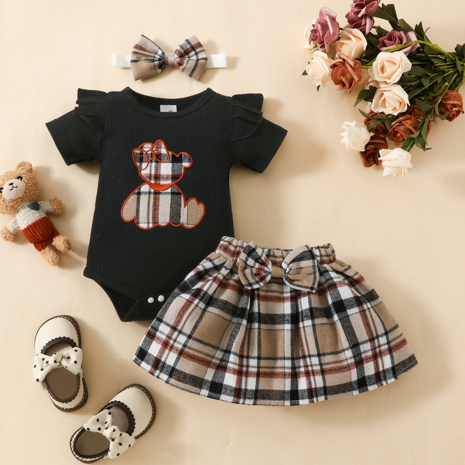Body acanalado con bordado de oso y pollera cuadrille marrón con vincha