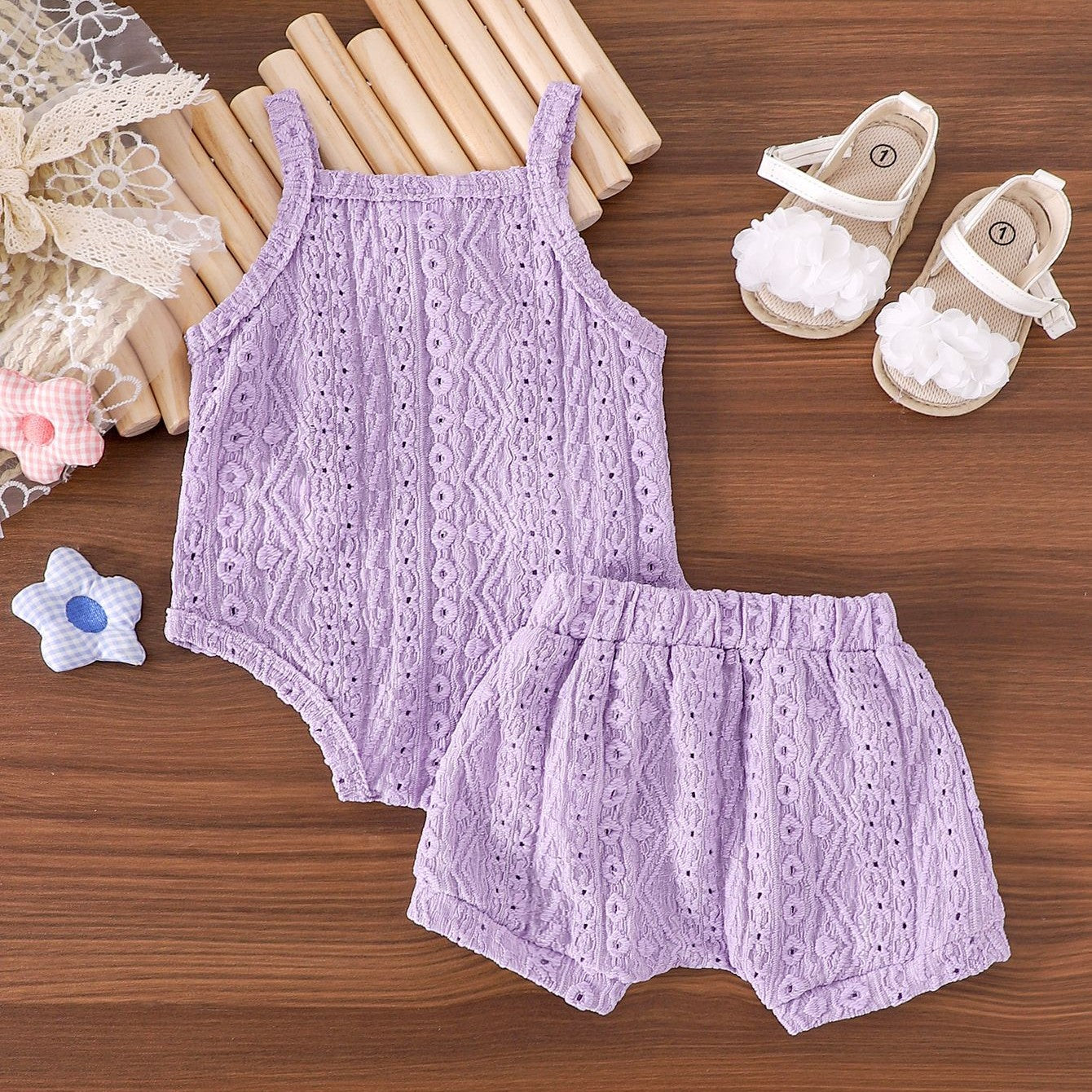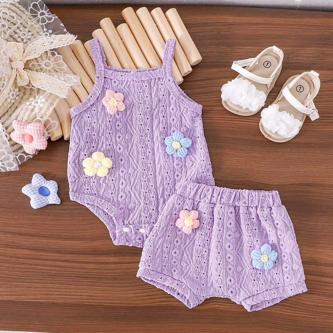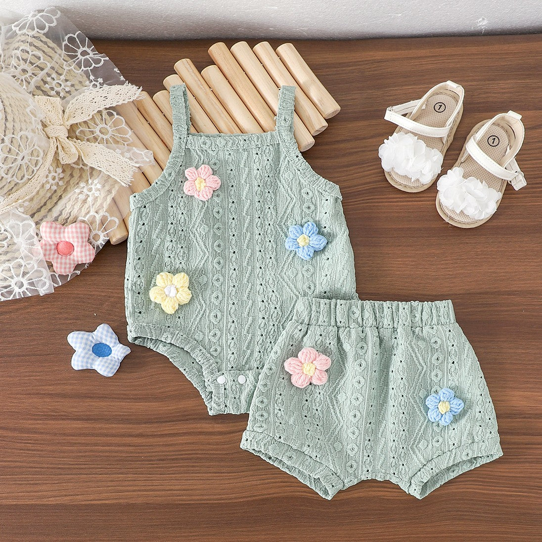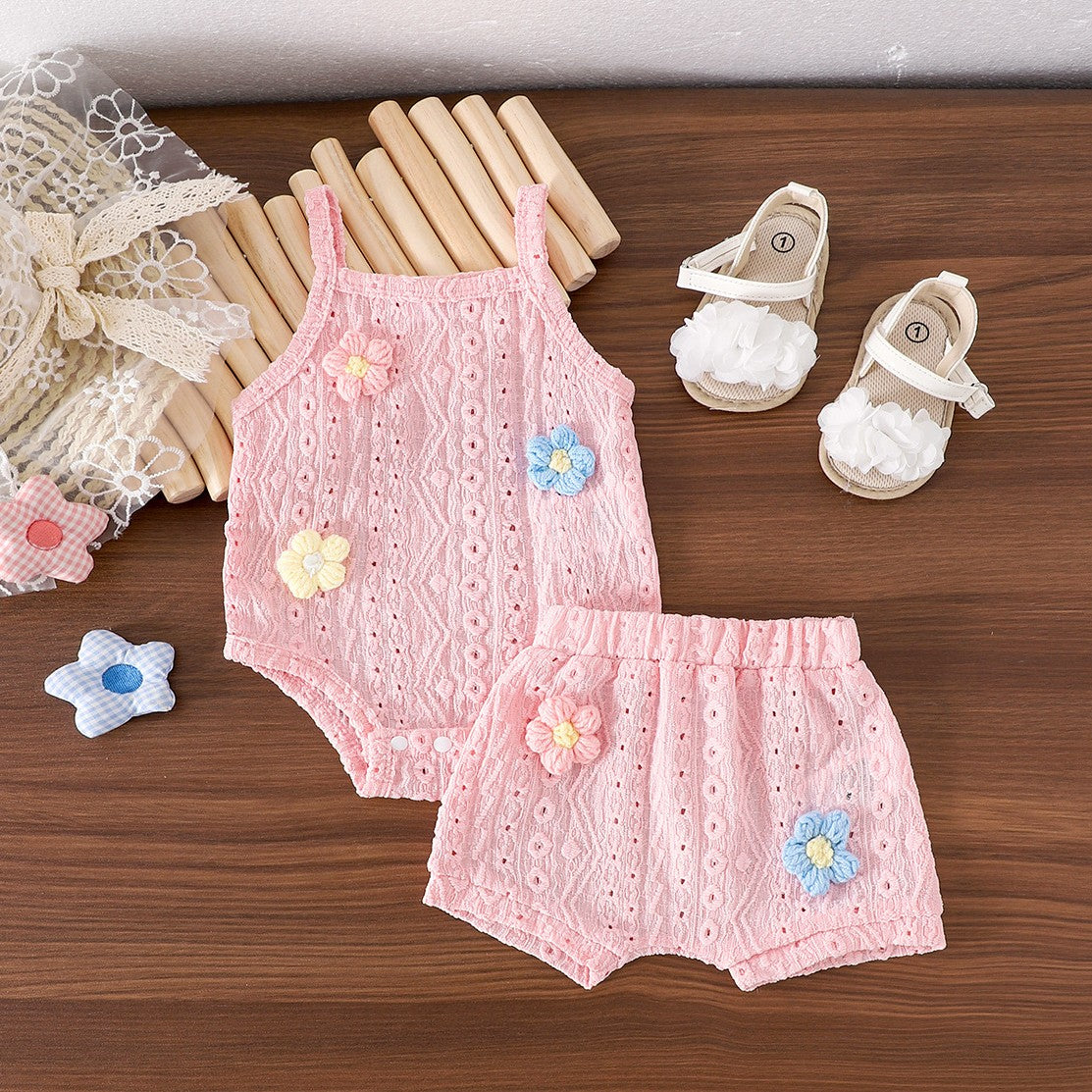 Body tipo broderie con detalles de flores y short