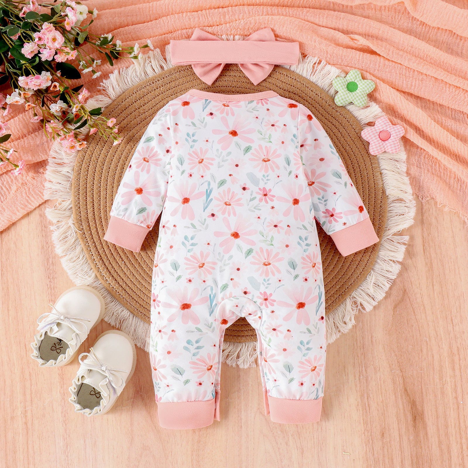 Body enterizo blanco con estampas de flores, moño y vincha rosa
