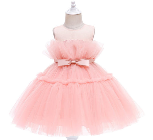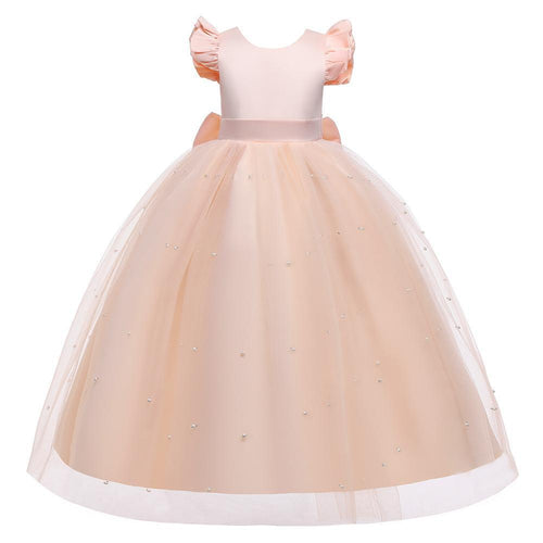 Vestido largo con volado, moño grande y falda de tul con perlas