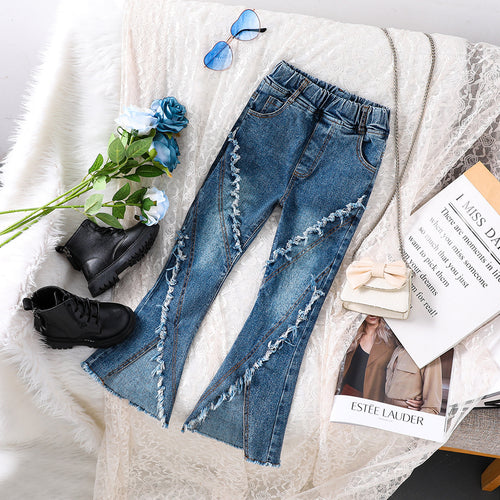 Pantalón pata ancha jeans con pompom y bordado de conejo con forro