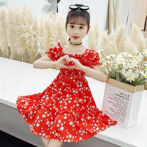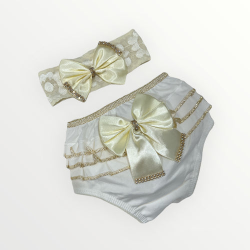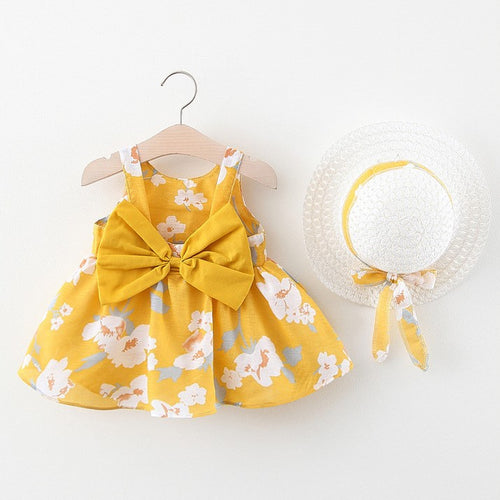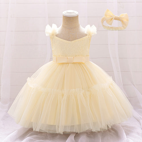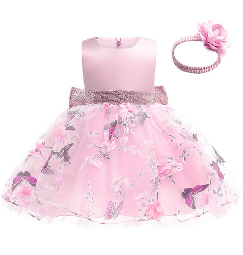 Vestido con detalles de flores y mariposas, cinto de lentejuelas, moño y vincha
