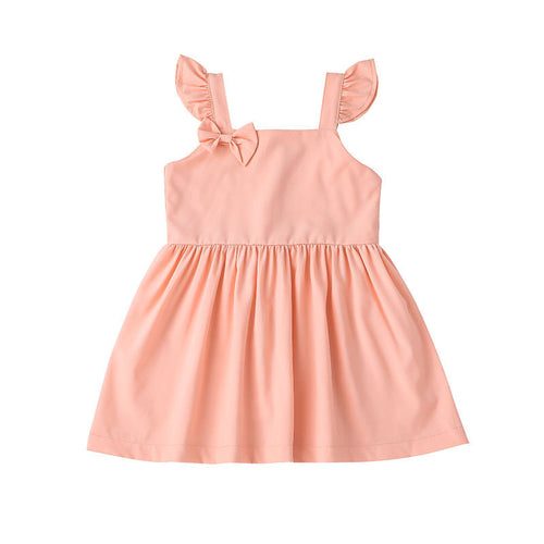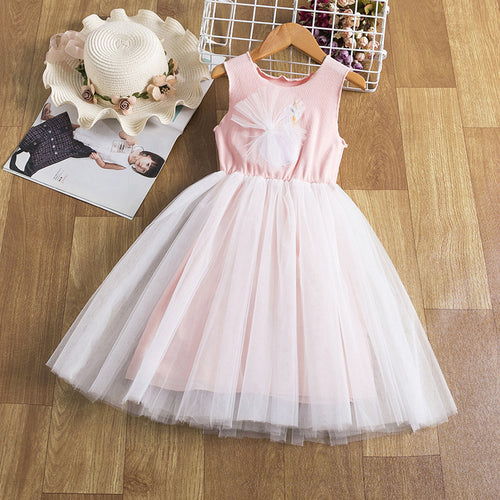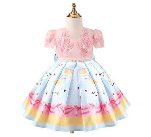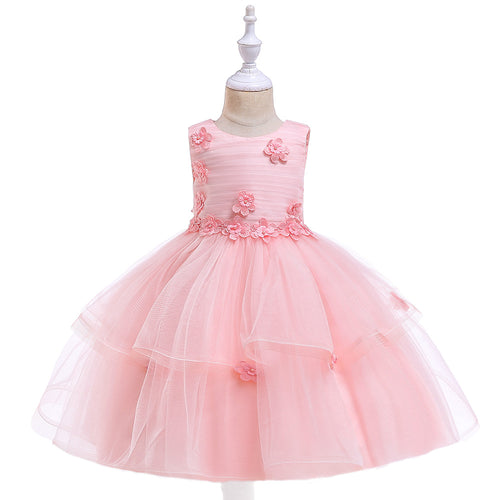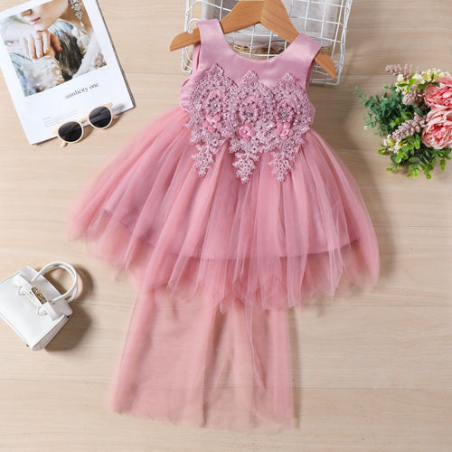 Vestido rosa escalonado con detalles de flores y mariposas y vincha