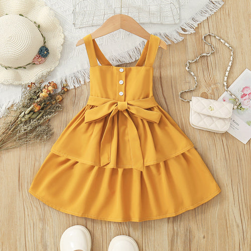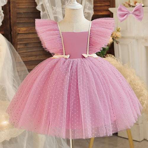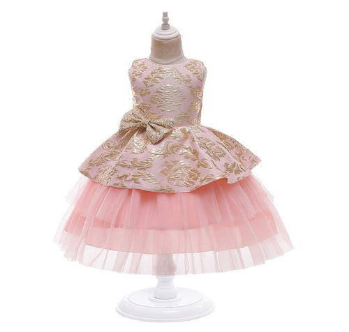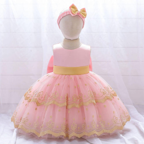 Vestido con mangas de tul, moño y detalles en dorado con moño