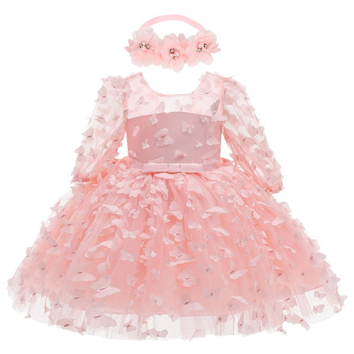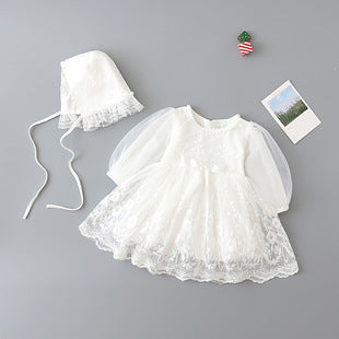 Vestido blanco manga larga con tul y encajes de flores con gorra