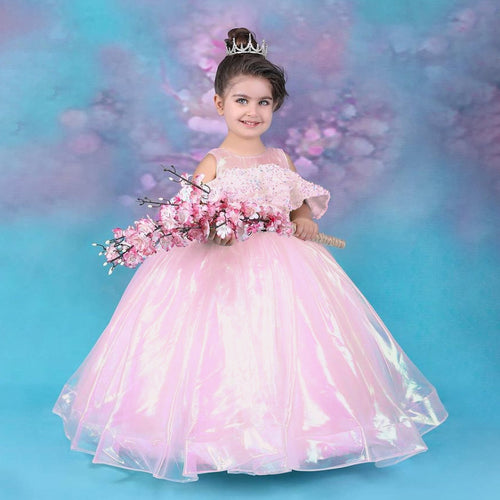 Vestido largo rosa con volados en el pecho y detalles de lentejuelas