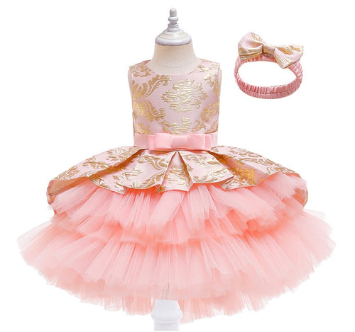 Vestido escalonado con detalles en dorado, vincha incluido