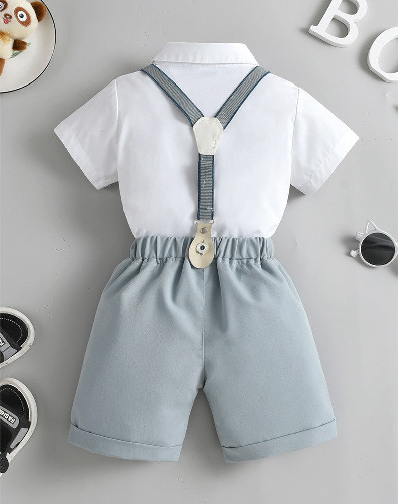 Camisa blanco con short, moño y tirante gris