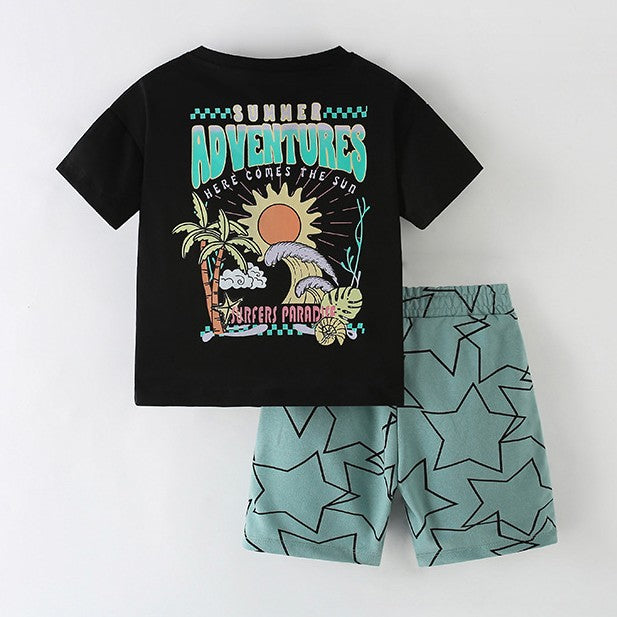 Remera negro con estampa grande atras y short verde con estrellas