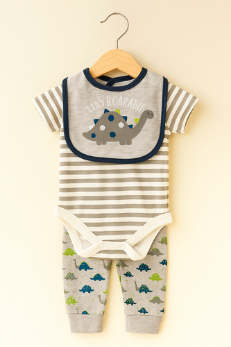 Camisa blanco estampado de dino con short beige, tirante, moño y boina