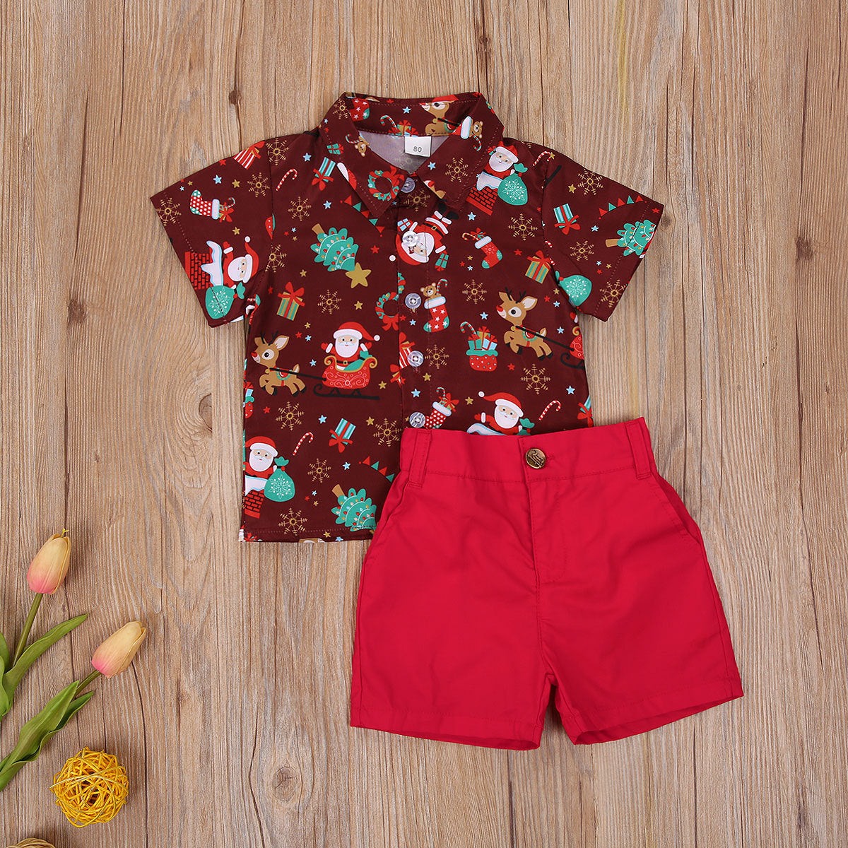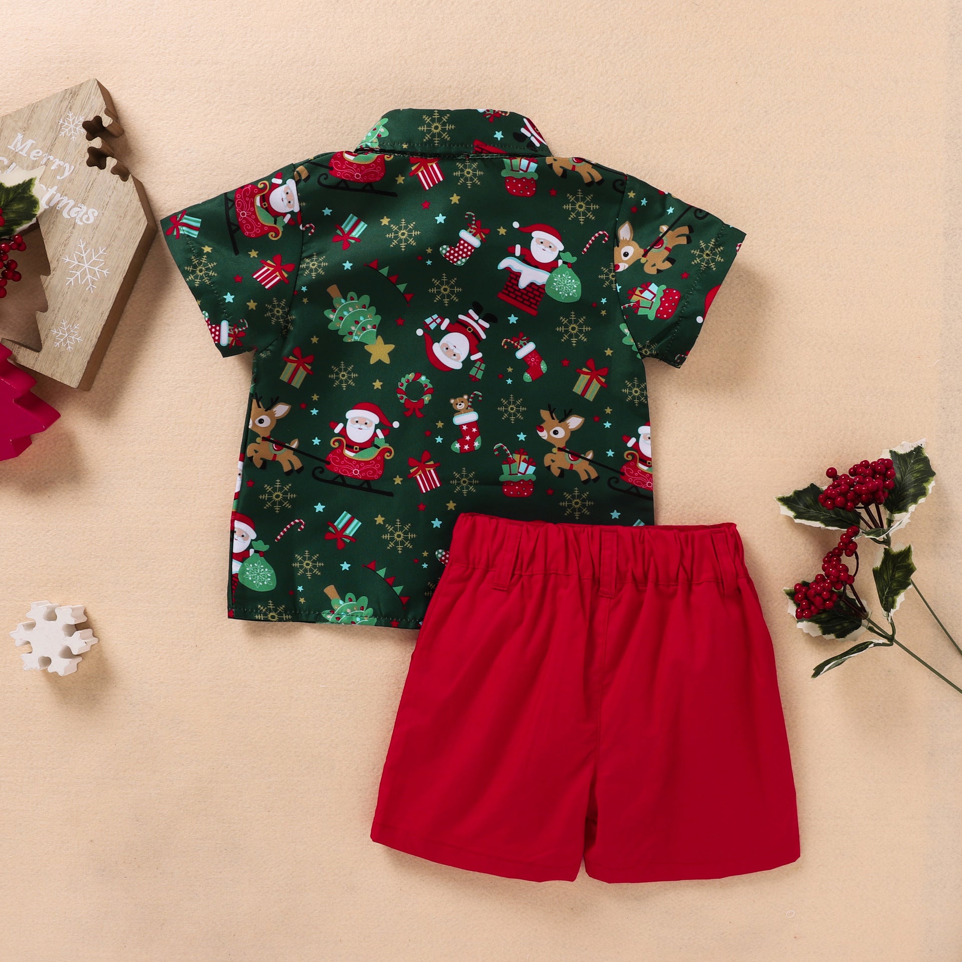 Camisa con estampas navideñas y short rojo