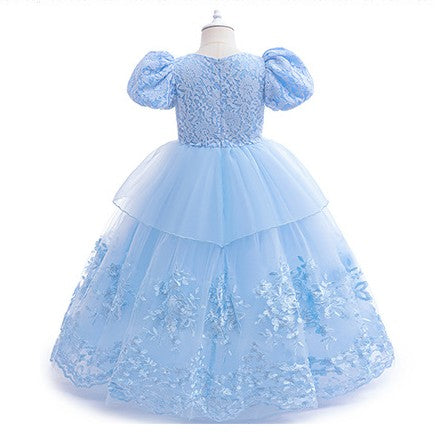 Vestido largo celeste bordados de flores y mariposas con mangas abullonadas