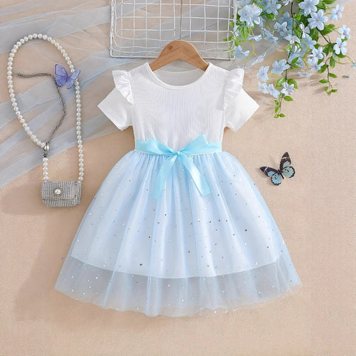 Vestido blanco, falda de tul celeste con brillo y cinto