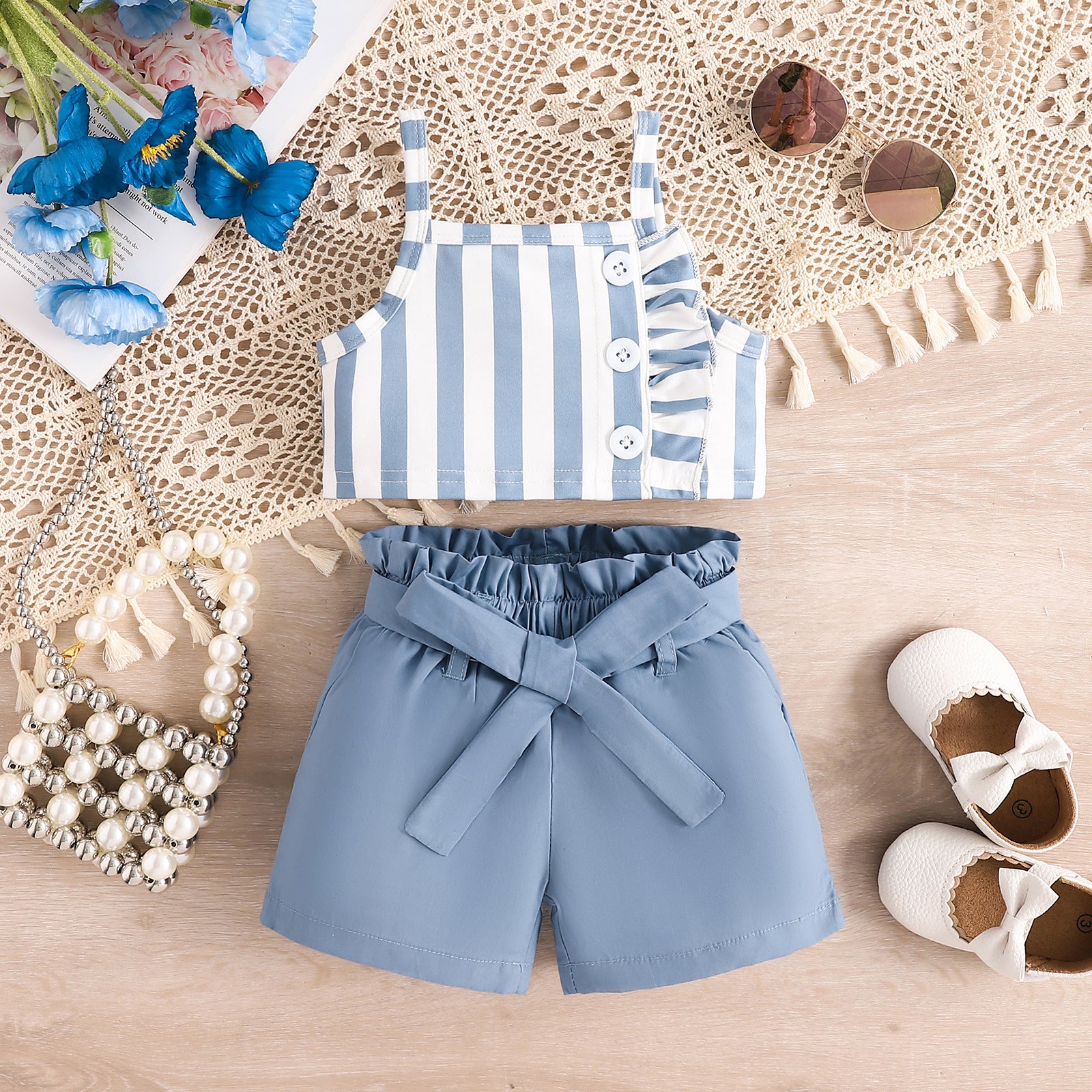 Crop a rayas con volado y short con cinto azul mate