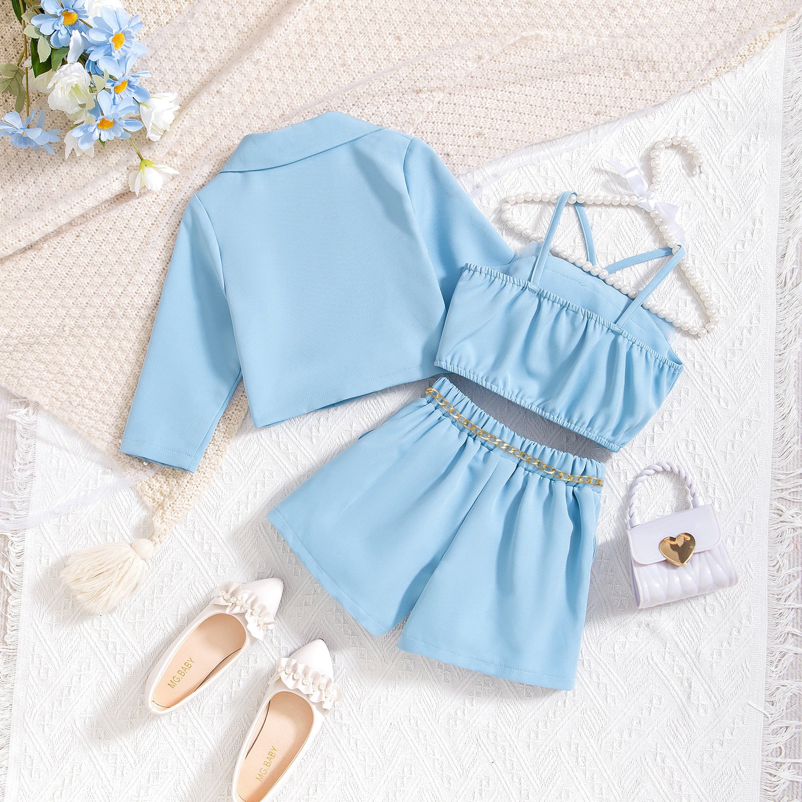 Crop top con flor de tul, blazer y short con cinto