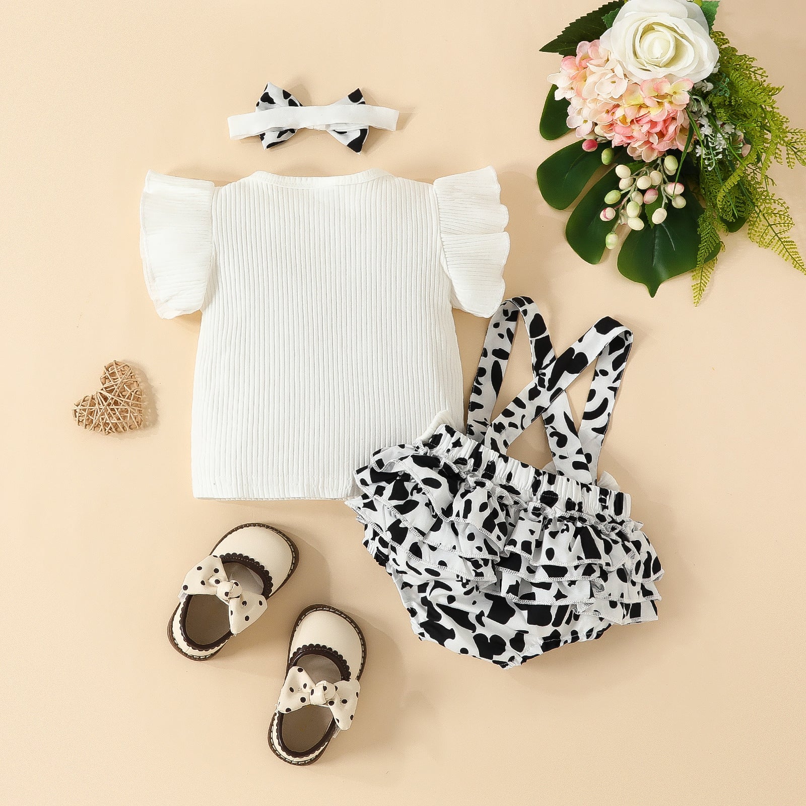Blusa blanca acanalado, cubre pañal de vaca con tirante y vincha