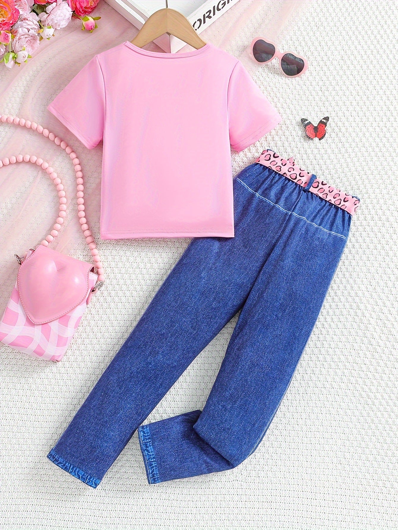 Blusa rosa con estampas y leggins tipo jeans rasgado con cinto tipo animal print