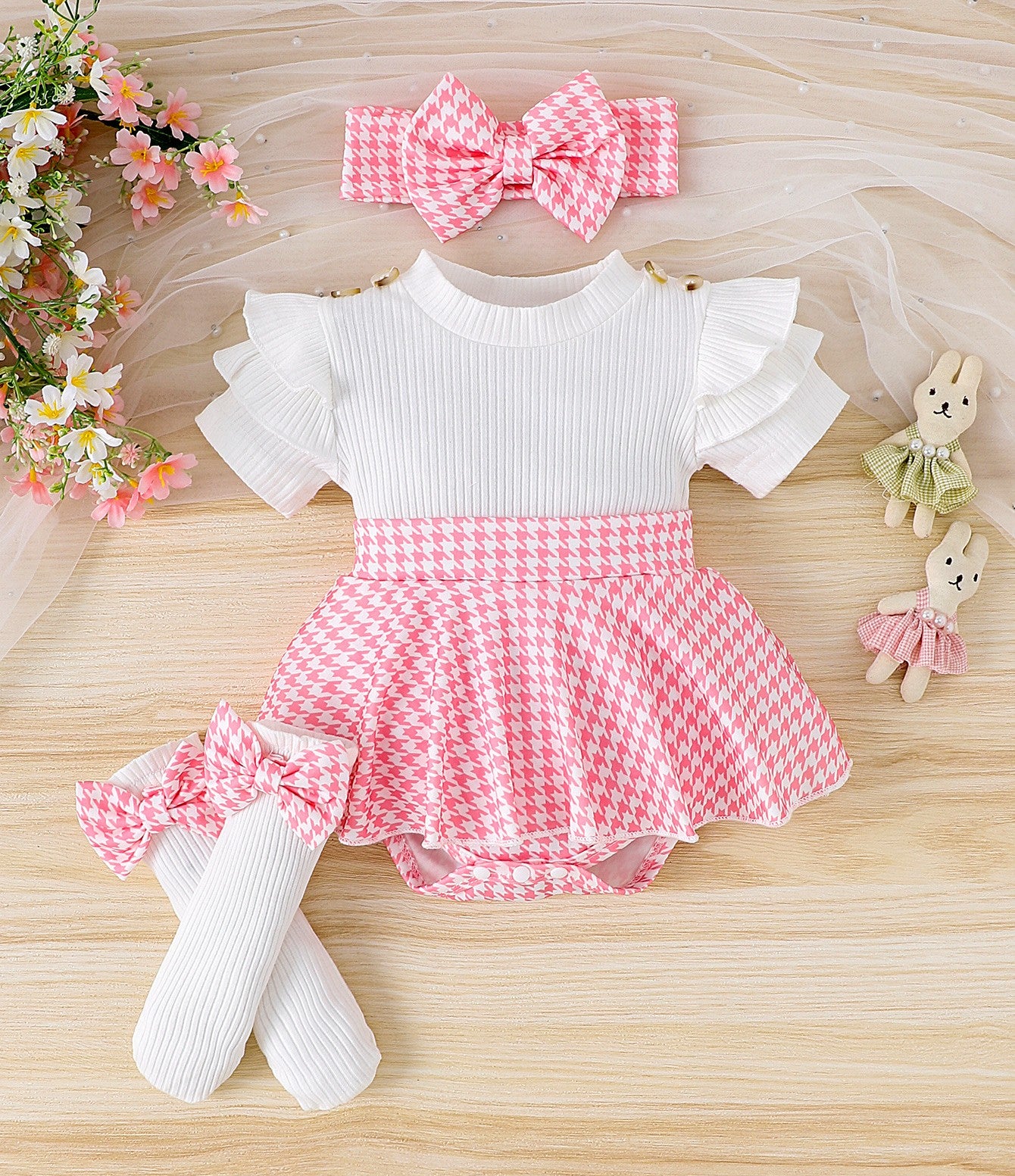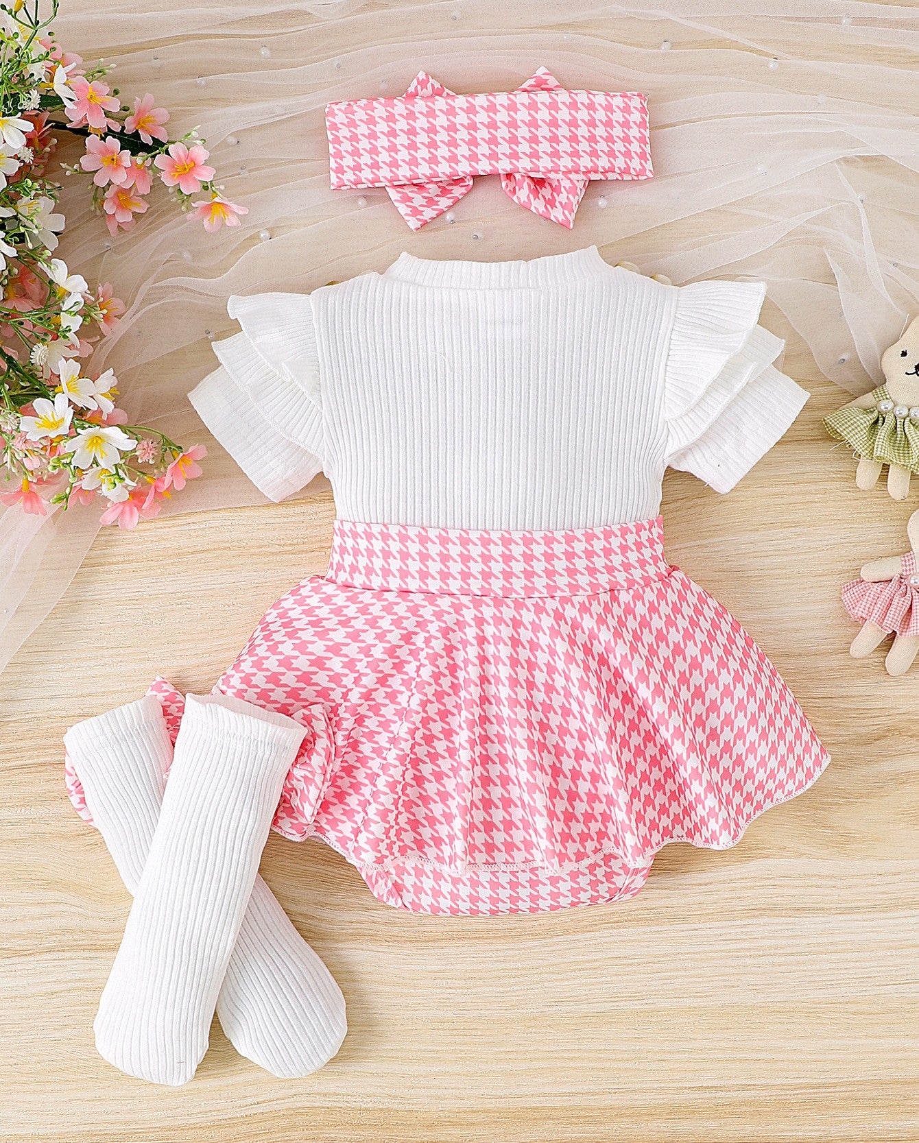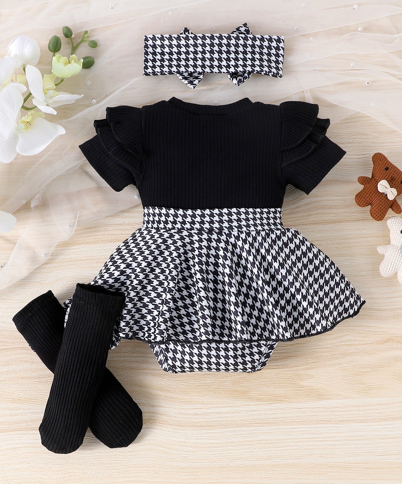 Body vestido con falda y vincha cuadrille, medias largas con moños