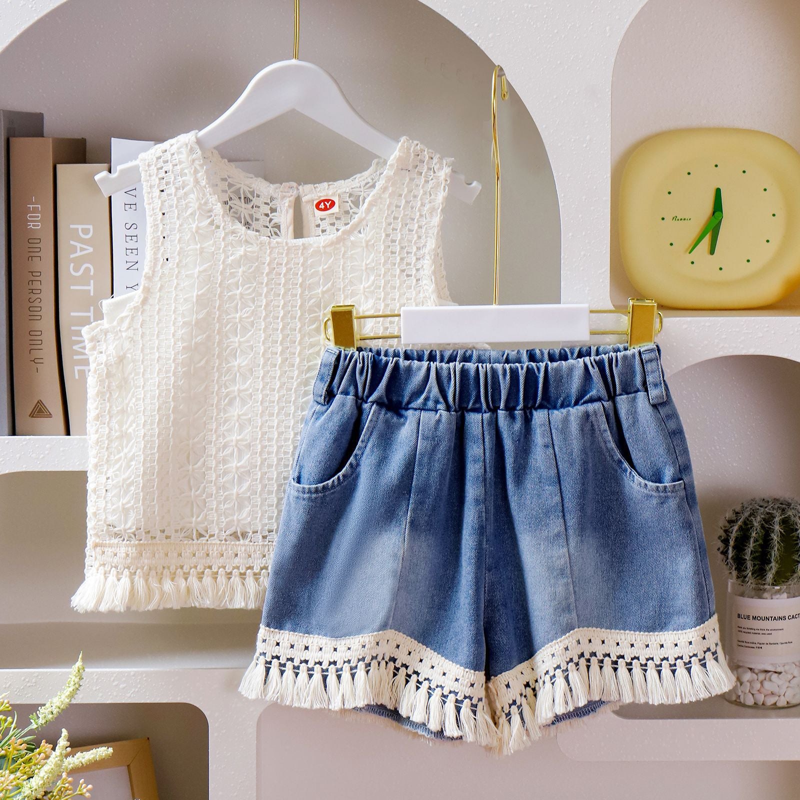 Crop top blanco, blusa de hiloy short jeans con flecos