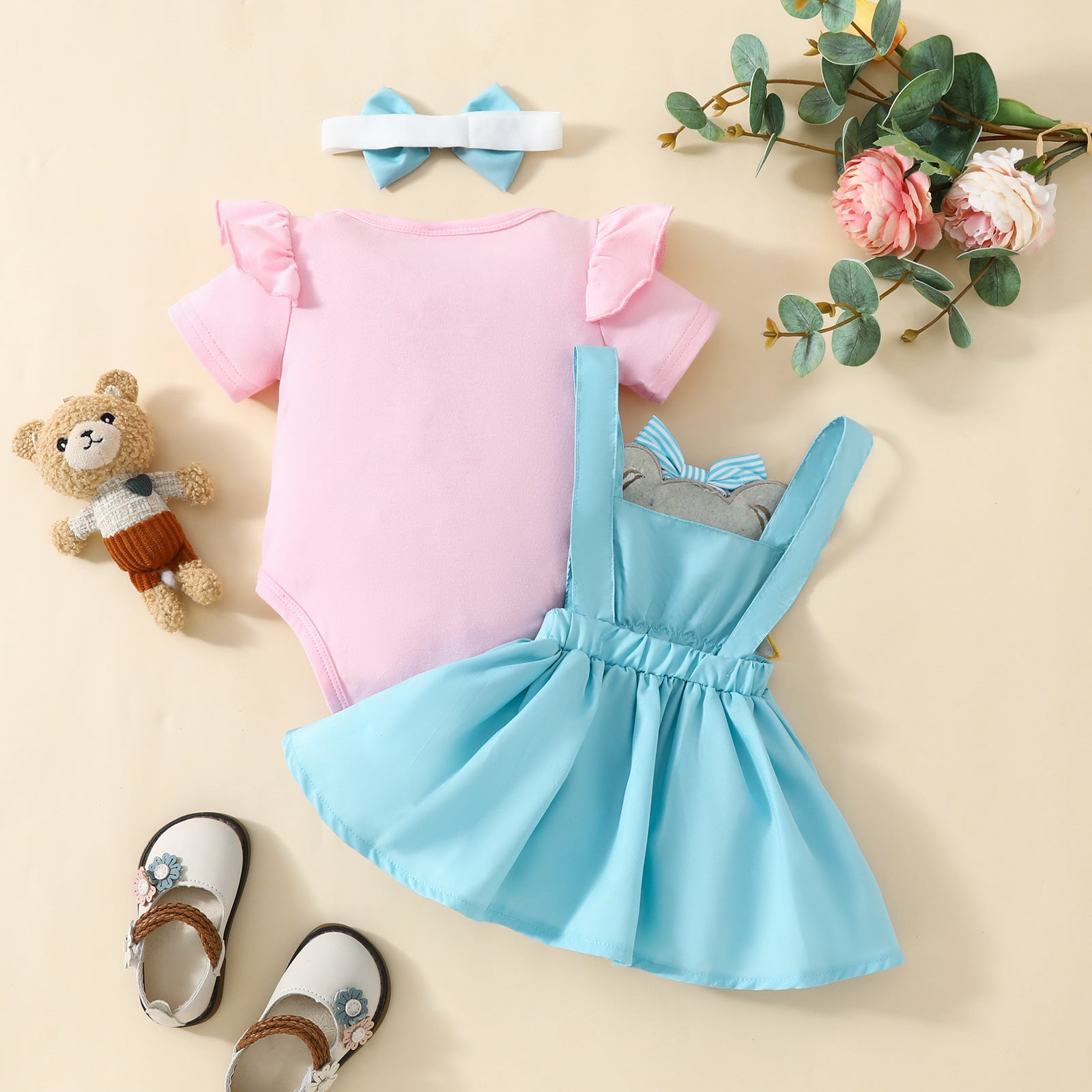 Body rosa y pollera con tirante celeste de oso con vincha