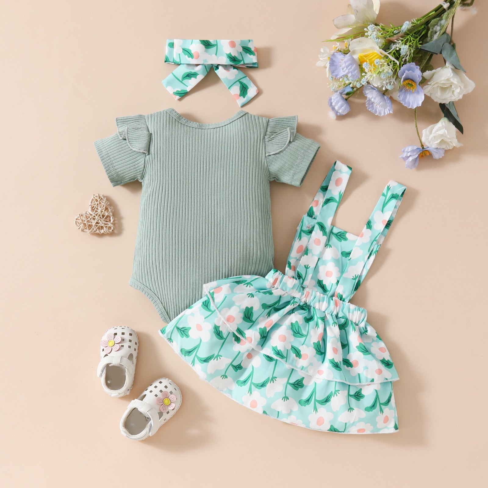 Body verde acanalado y jardinera floreado con vincha