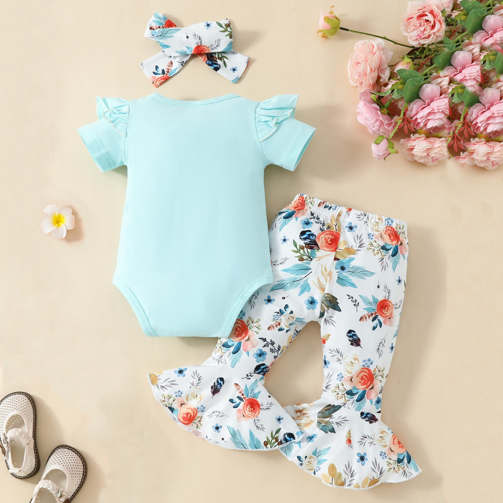 Body verde agua, pantalón pata ancha con estampas de flores y vincha