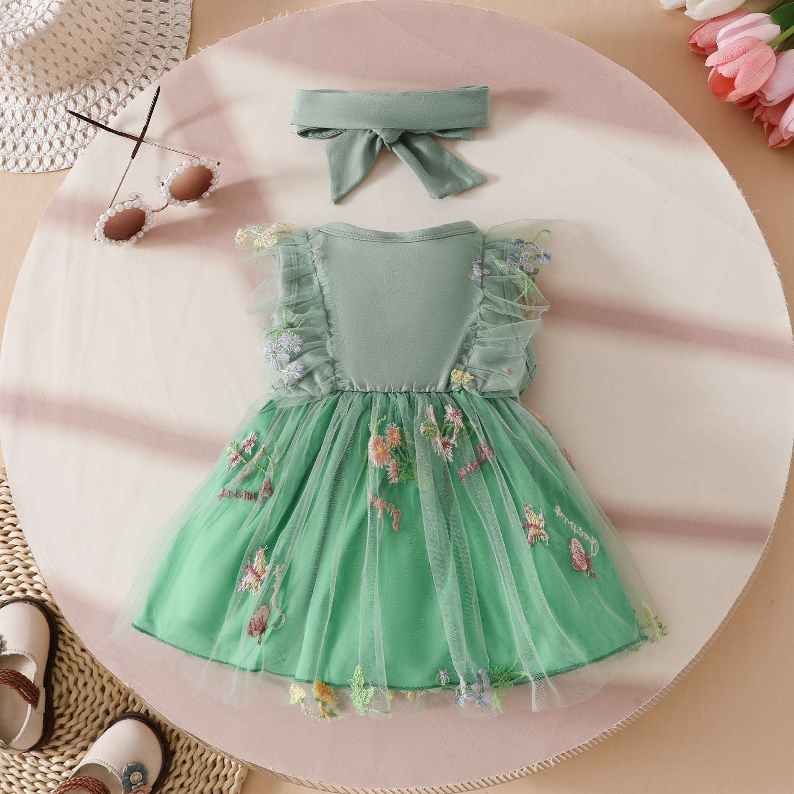 Vestido verde con falda de tul, bordados de flores y vincha