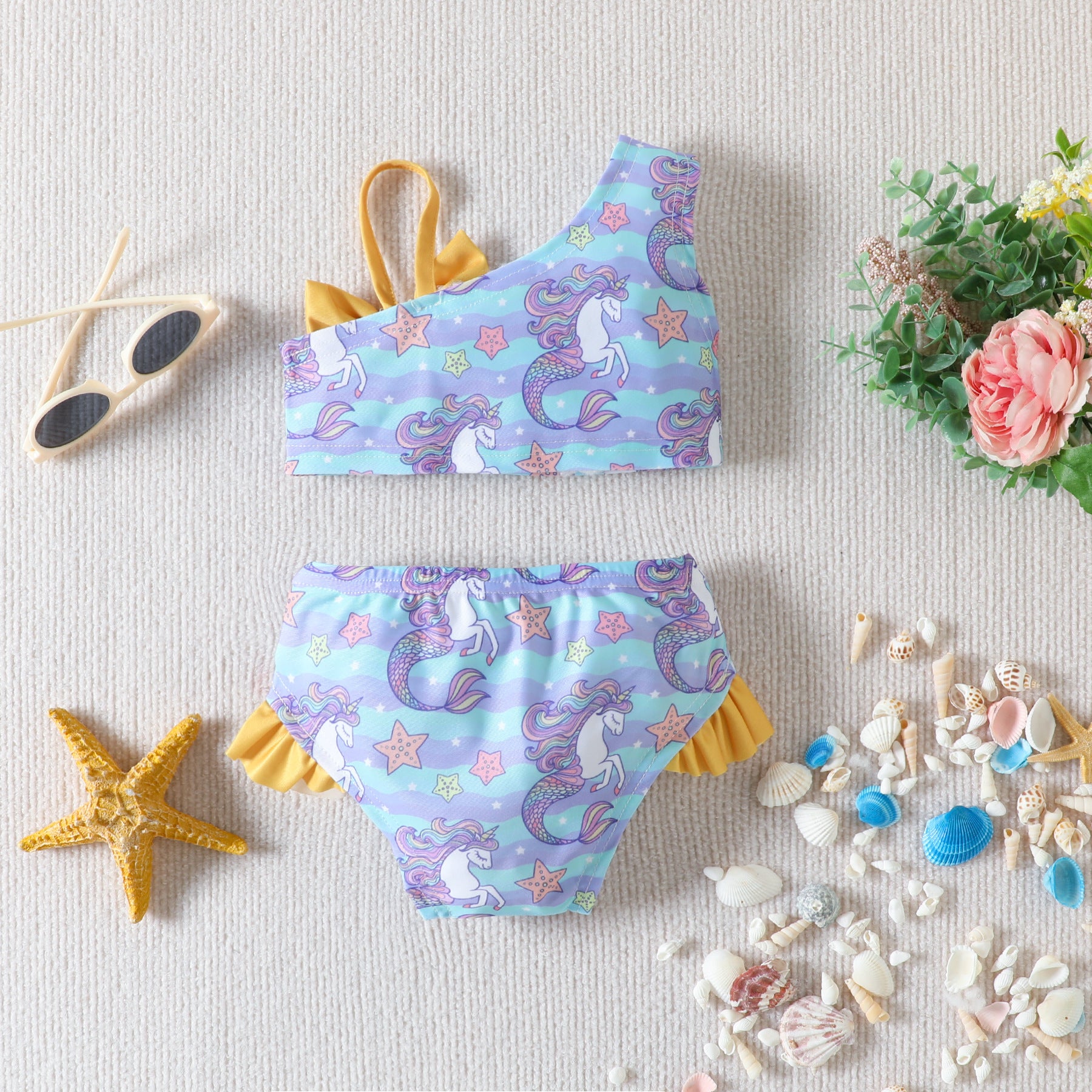 Traje de baño celeste con estampas de sirena-unicornio y moño amarillo