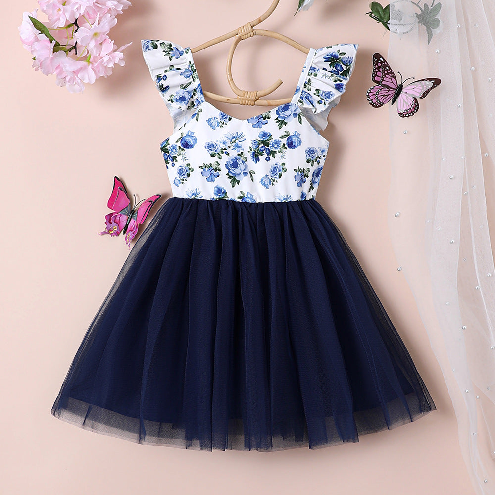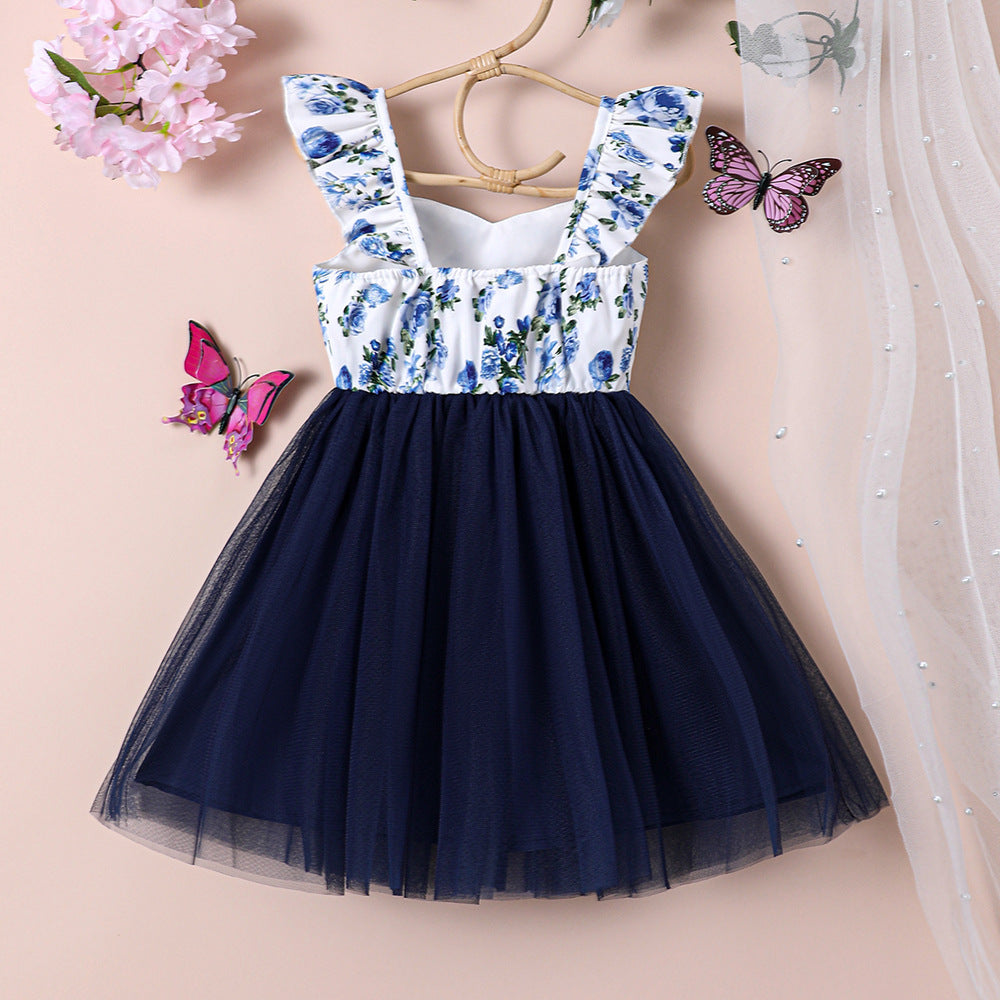 Vestido blanco con estampas de flores y falda de tul azul marino