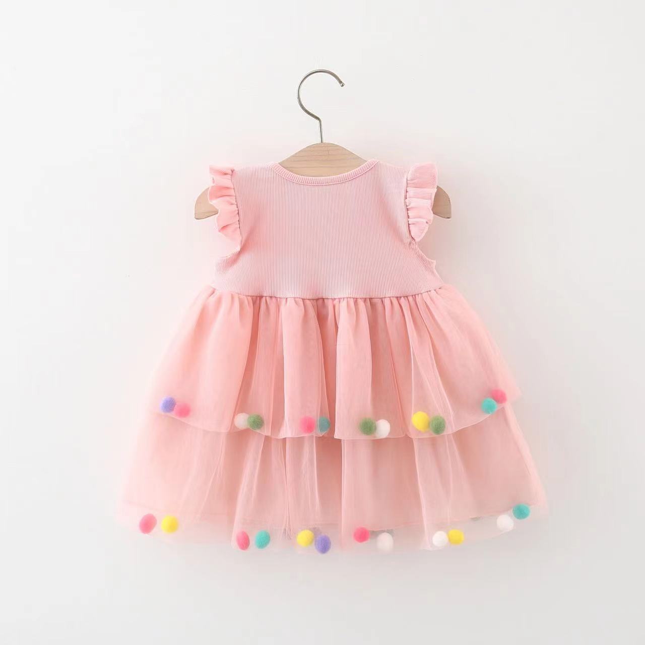 Vestido rosa con moño y tul con pompones