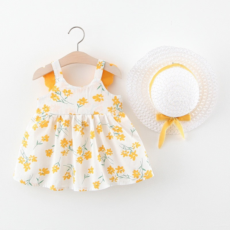 Vestido blanco con estampas de flores, alas y sombrero