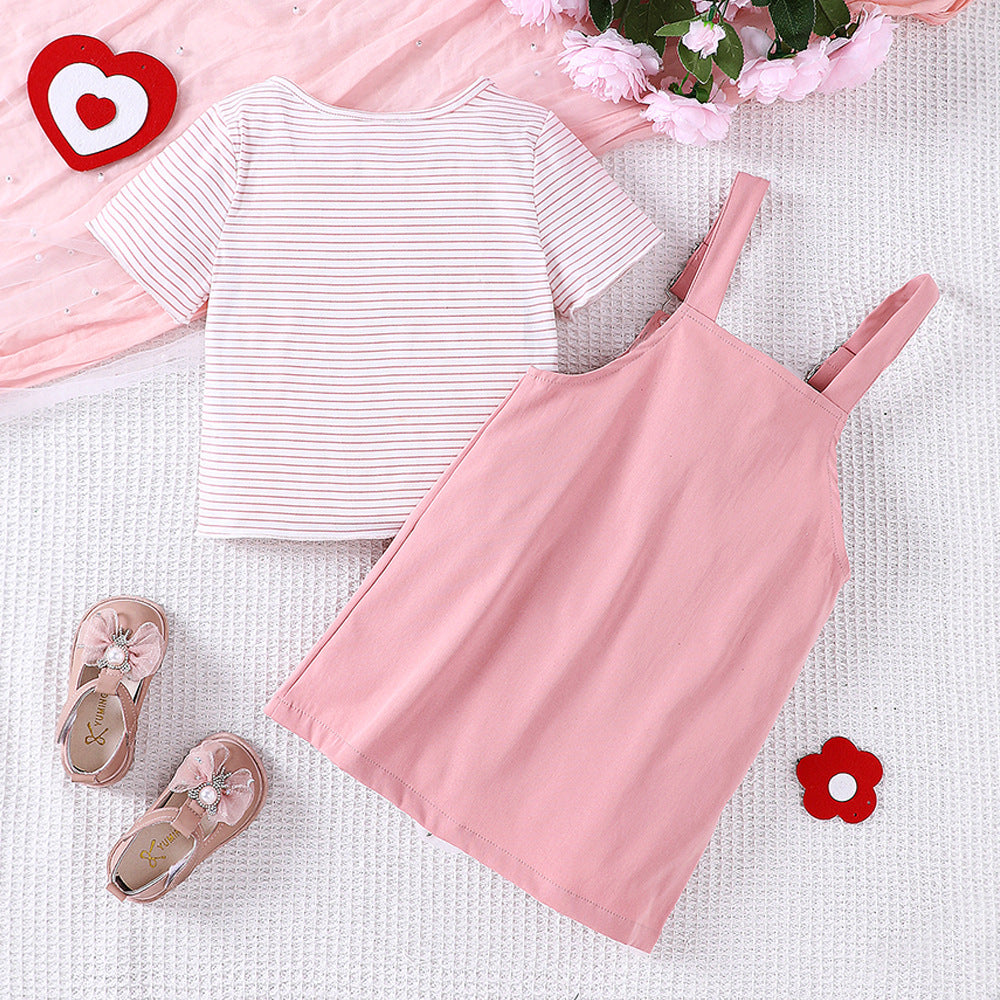 Vestido rosa tipo jardinera con remera blanca a rayas