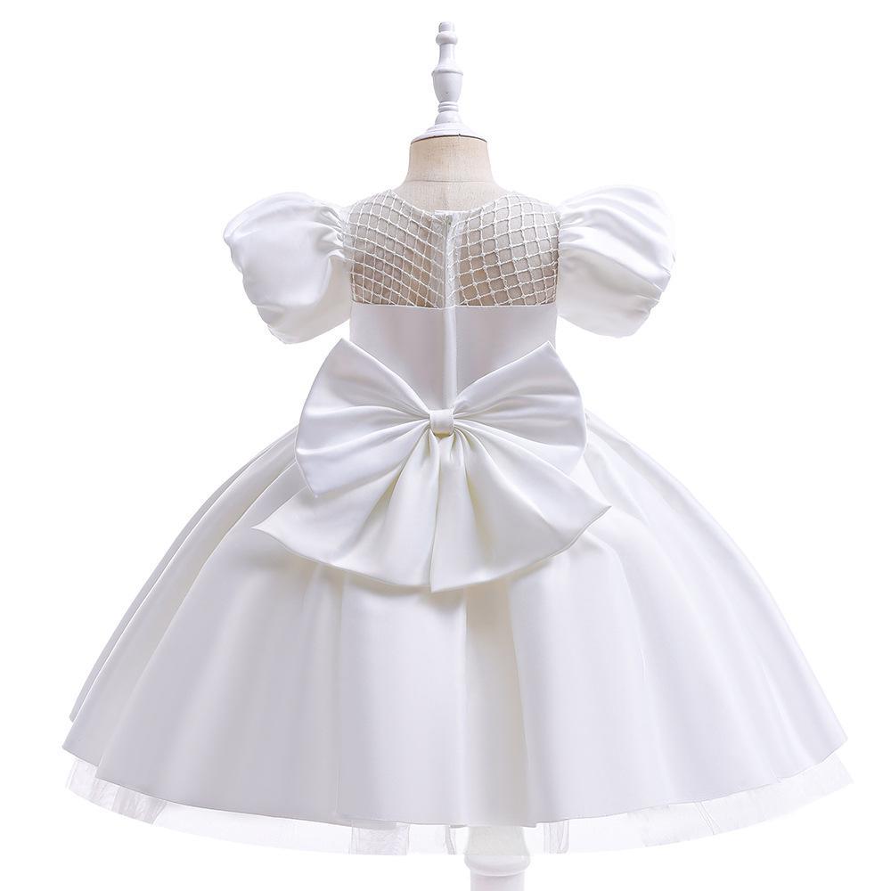 Vestido blanco con detalles de red, mangas abullonadas y moño