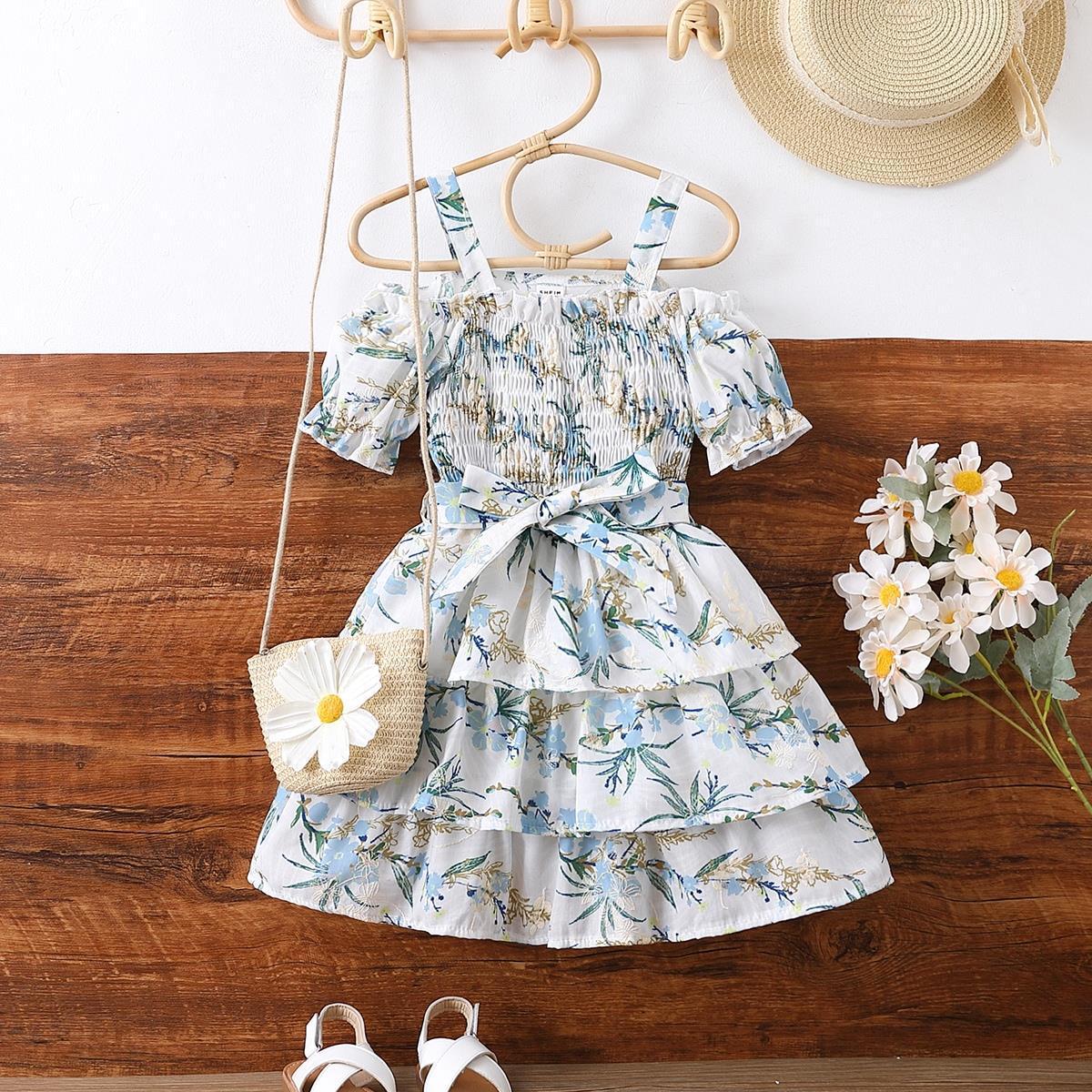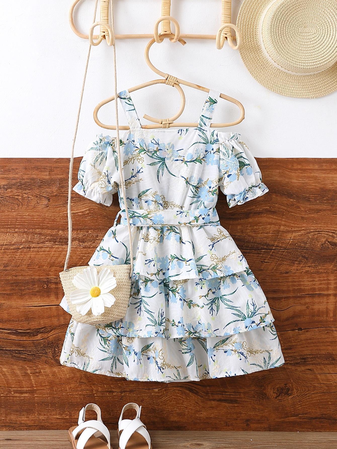 Vestido blanco engomado, escalonado con estampas de flores y cinto