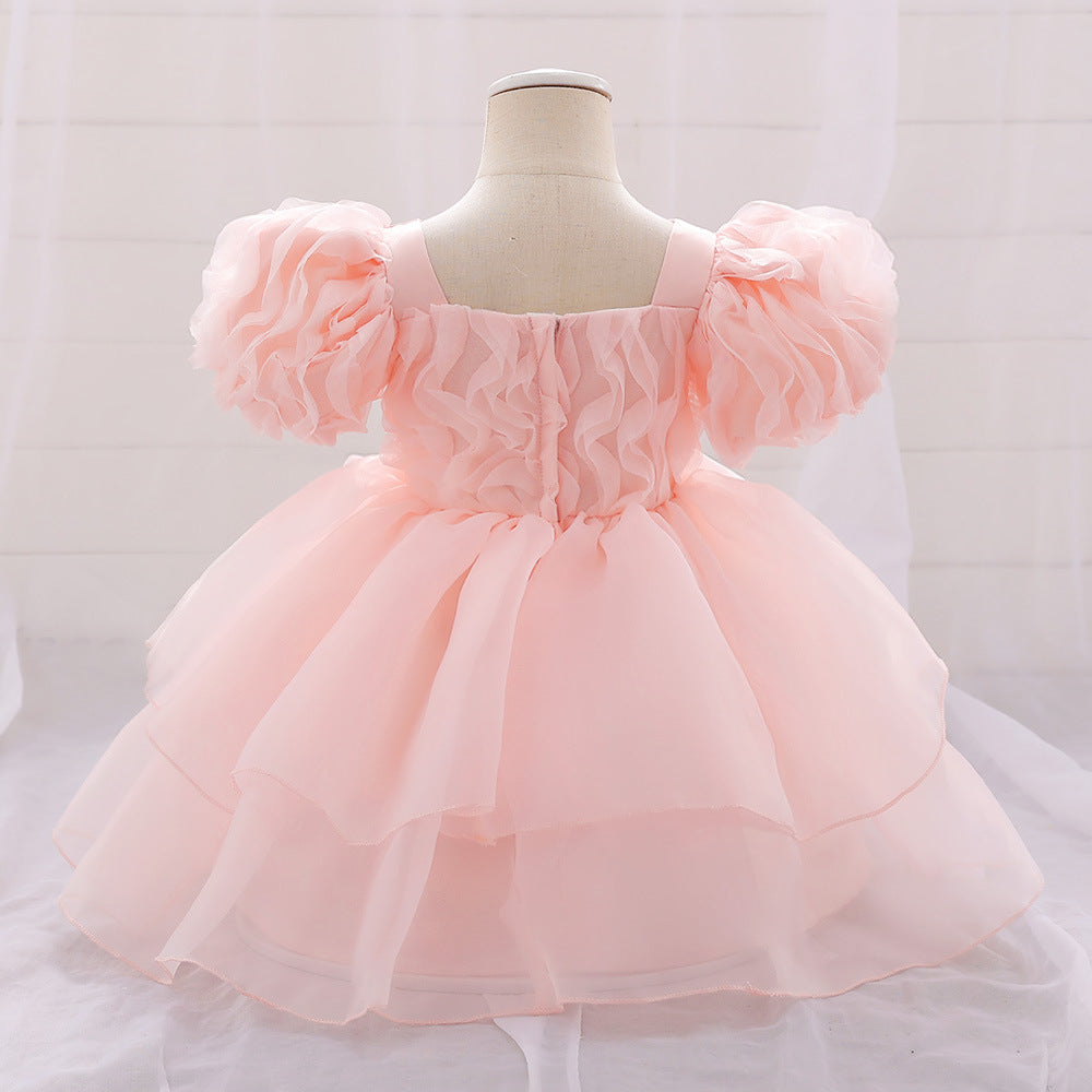 Vestido rosa con volados y falda de tul escalonada