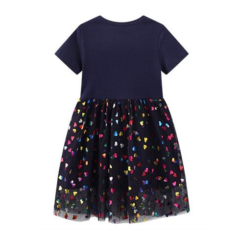 Vestido azul marino de unicornio y falda de tul con motas de corazones