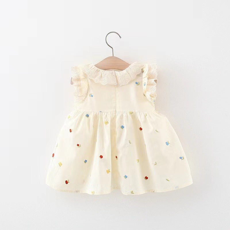 Vestido crema con volados y bordados de flores