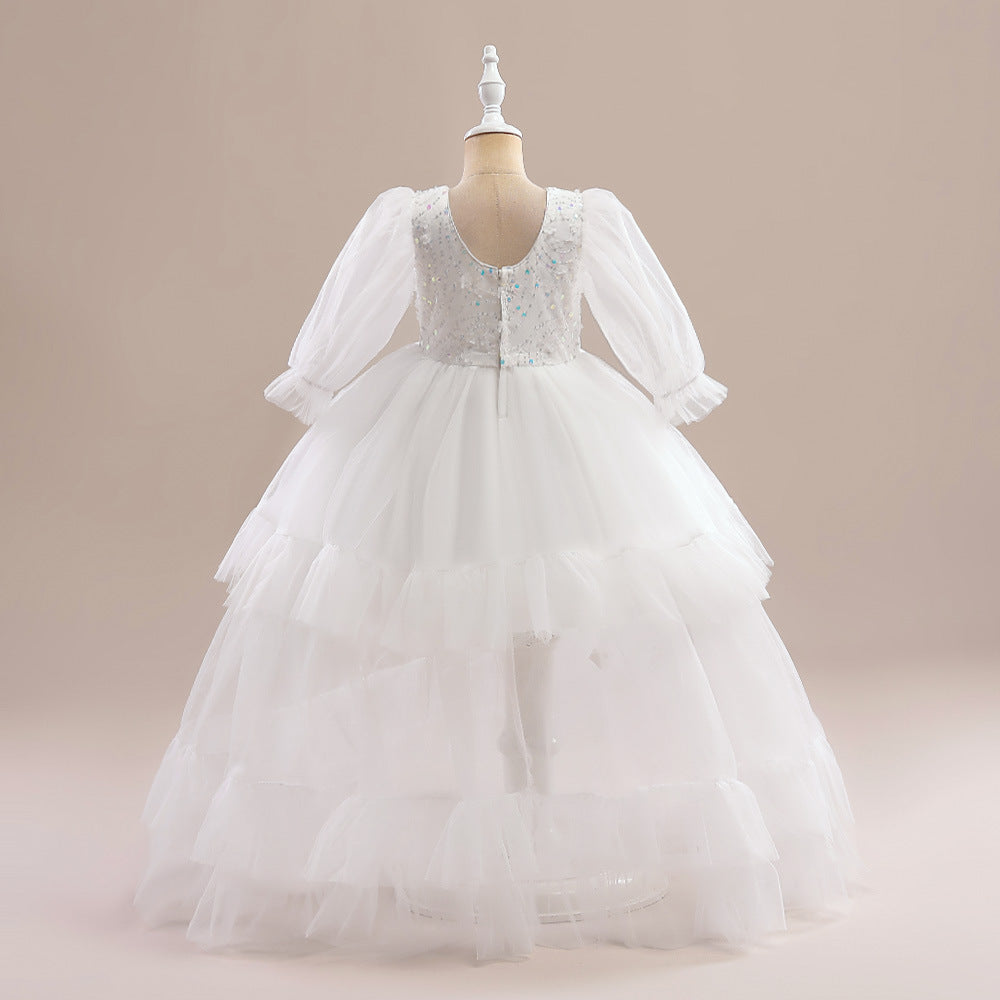 Vestido media manga blanco, largo de tul escalonado con bordados