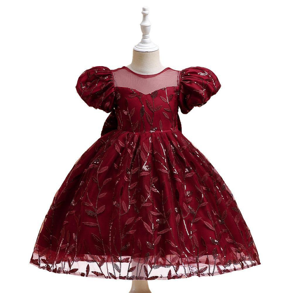 Vestido bordo con mangas abullonadas y bordados de hojas con moño