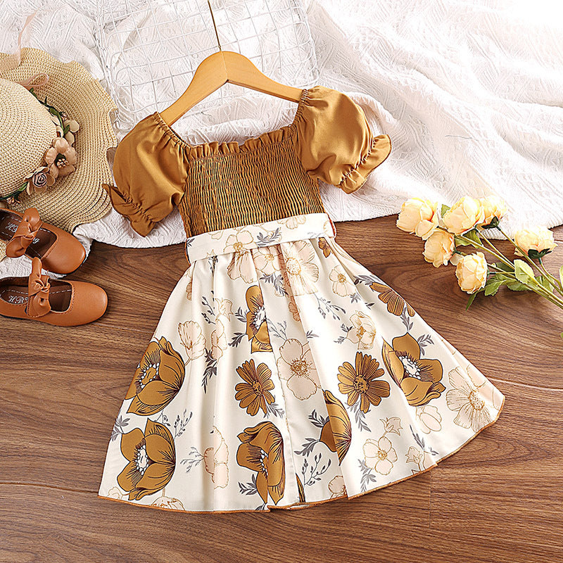 Vestido caqui engomado y falda con estampas de flores con cinto