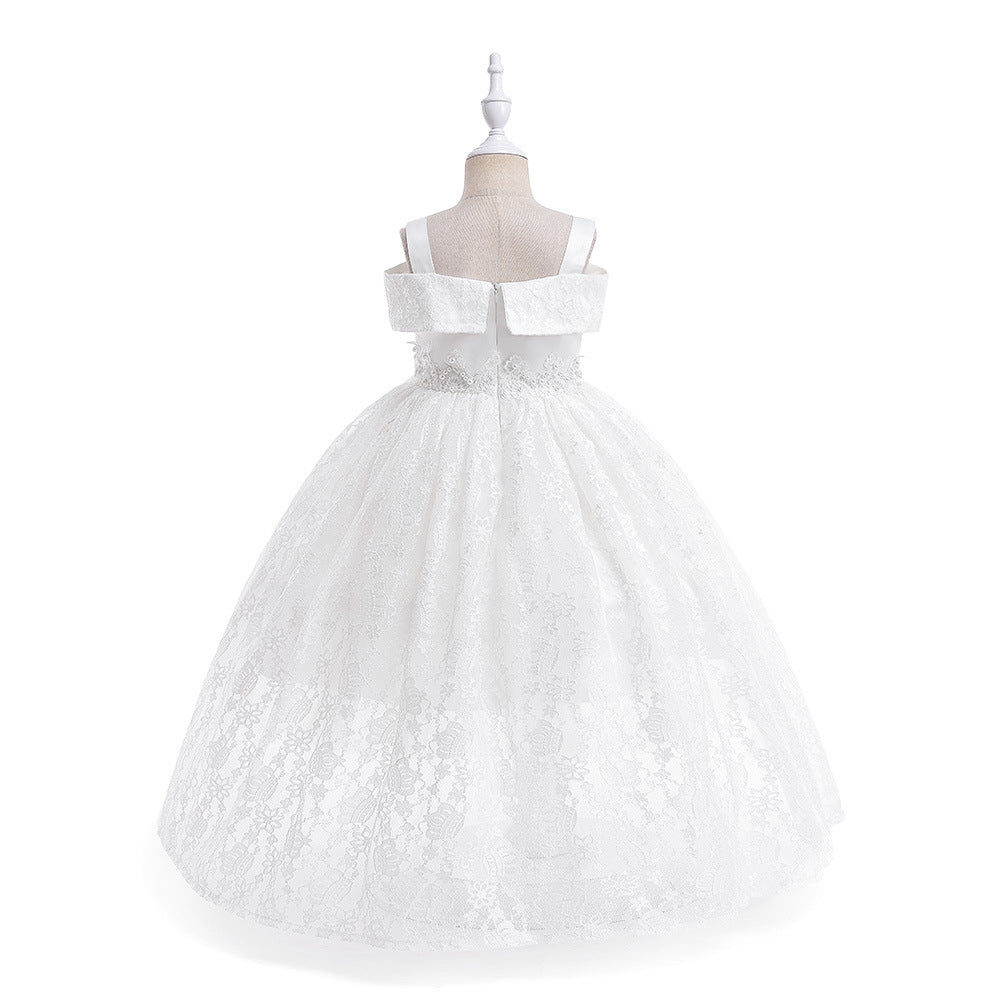 Vestido blanco con hombros recto y cola de pato de tul con bordados