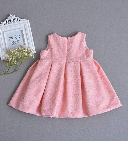 Vestido rosa de encaje con perlas en la cintura, moño y gorra