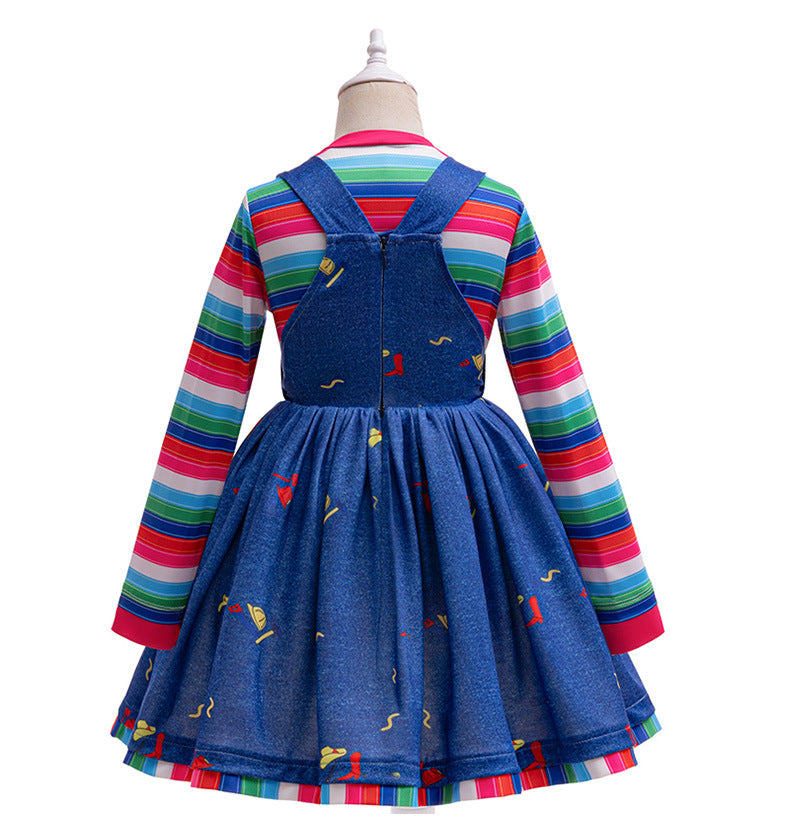 Vestido tipo jardinera azul y blusa a rayas colorido estilo el muñeco Chucky
